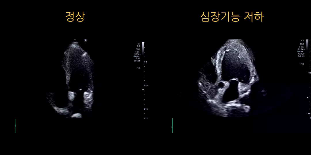오랫동안 고혈압을 가지고 계셨지만 관리하지 않으셔서 심부전(심장기능저하)가 나타난 환자분 심장초음파 결과